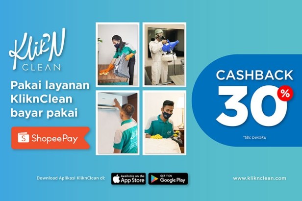 Selain menawarkan paket yang terjangkau, KliknClean juga memberikan kemudahan dan keuntungan menggunakan pembayaran digital ShopeePay dan promo cashback 30% lewat aplikasi KliknClean (HG)