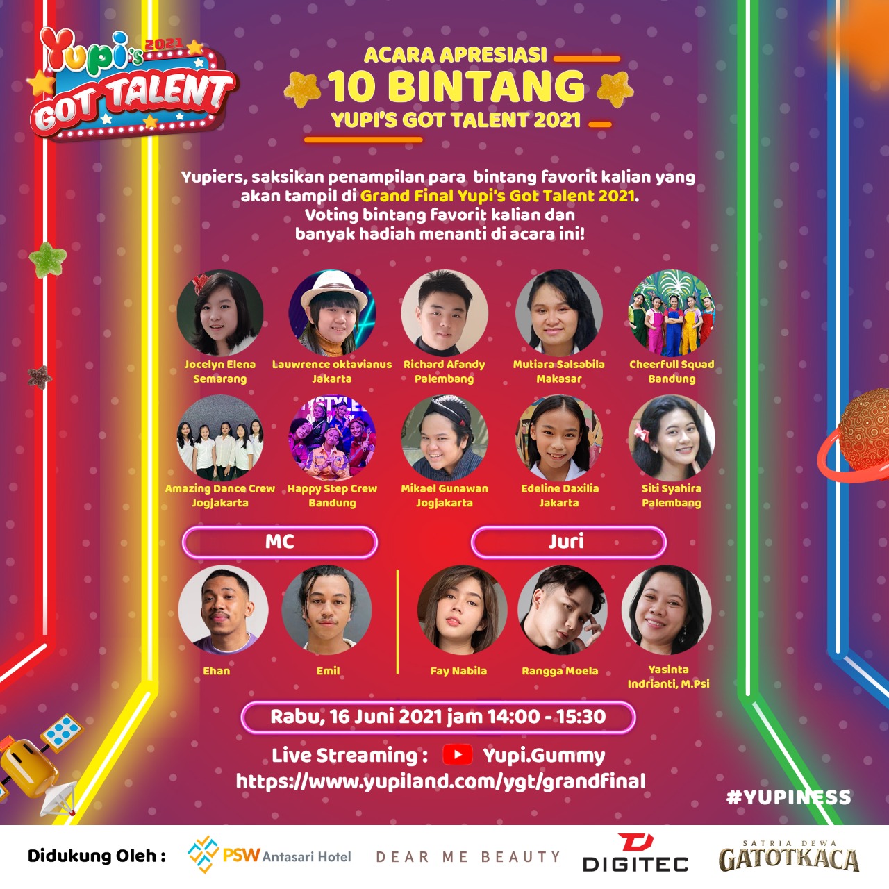 Sejalan dengan semangat Yupiness, permen kenyal ini menghelat kegiatan dengan memberikan kesempatan bagi remaja Indonesia yang memiliki talenta di bisang seni. “Siapa saja yang memiliki talenta menyanyi, menari dan lainnya seperti story telling, gymnastic dan bermain musik, bisa ikut,” ujar Juliwati Husman, Direktur Sales & Marketing PT. Yupi Indo Jelly Gum dalam temu media daring, Kamis (10/6).