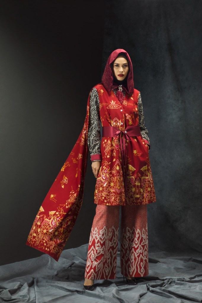 Detil selendang di bagian belakang, menambah kesan elegan dan klasik koleksi ini. Warna marun terlihat kontras dengan batik warna hitam d bagian belakang tunik. Hijab bukan sekadar penutup kepala, tetapi menjadi penyempurna penampilan koleksi ini, dengan menggunakan material glitter. “Koleksi Nina Nugroho akan selalu identik dengan hijab. Jadi hijab akan selalu hadir dengan koleksi yang ditampilkan,” tutur Nina.