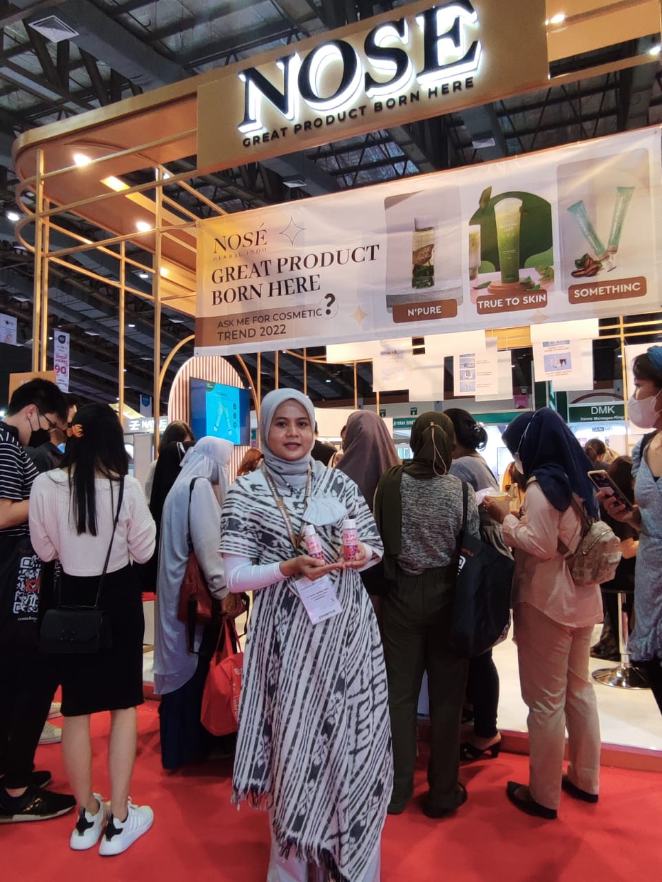 Ayu, GM Marketing PT Nose Herbalindo (Nose) – memegang produk di booth Nose di ajang pameran Cosmobeaute Indonesia 2022 (dok. Hidupgaya.co)