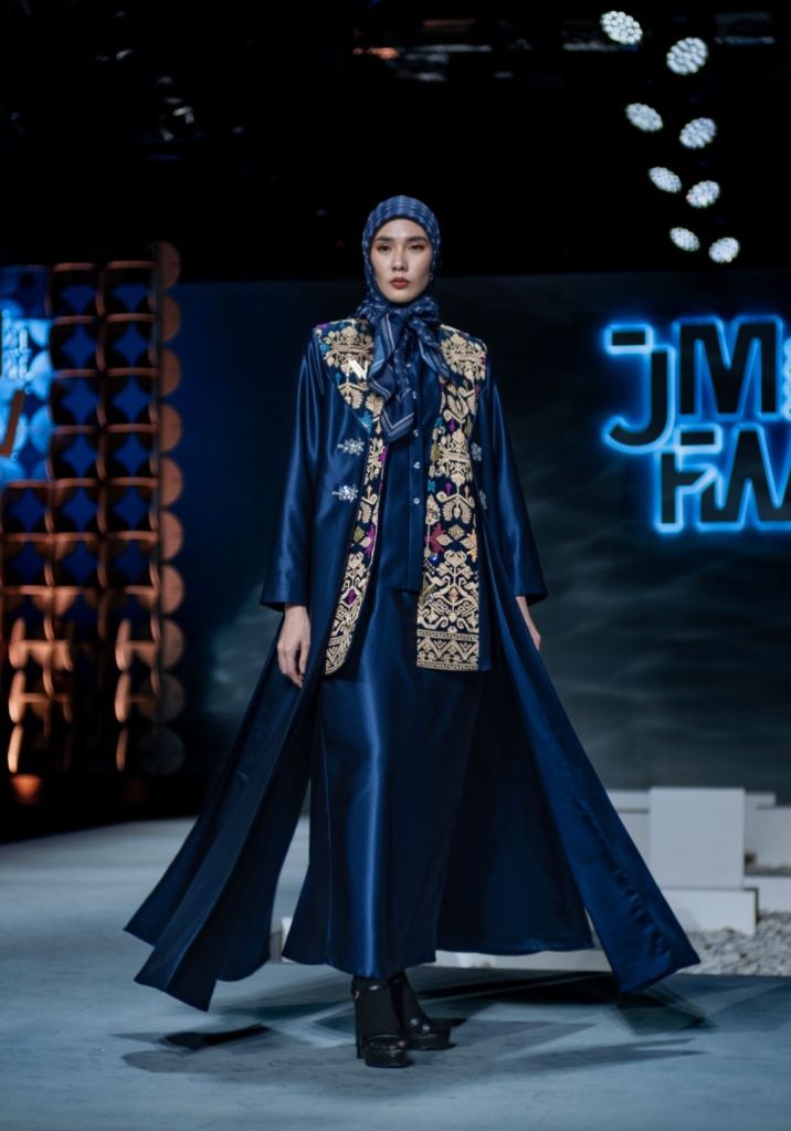 Calyara tetap menonjolkan siluet A-line yang menjadi identitas brand Nina Nugroho. Detail piping yang memberi garis tegas, double manset (wudhu friendly) yang fungsional, serta struktur blazer dan long outer yang tegas menegaskan karakter perempuan profesional: percaya diri, berwibawa, dan berkarakter kuat tanpa kehilangan sisi lembutnya. (HG)