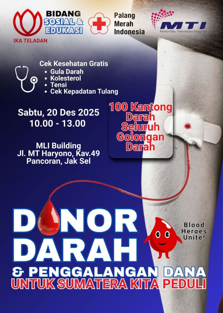 Sebagai bagian kepedulian terhadap nasib saudara sebangsa yang tertimpa bencana, Ikatan Alumni (IKA) Teladan melalui Bidang Kegiatan Sosial & Edukasi menunjukkan komitmen dalam kegiatan kemanusiaan dengan menggelar Aksi Donor Darah, yang bakal dihelat 20 Desember, pukul 10.00 – 13.00 WIB, di MLI Building, Jl. M.T. Haryono, Jakarta.