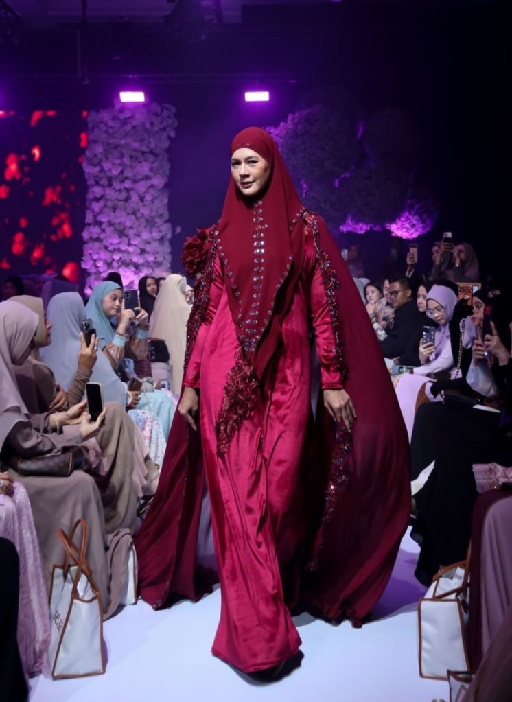 Tak ketinggalan, Celine Evangelista, pesohor yang hijrah dan tekun mempelajari Islam, tampil memukau dalam rancangan syari bernuansa glamor dengan detail kristal dan siluet flowy yang merepresentasikan kekuatan sekaligus kelembutan muslimah modern. (HG)