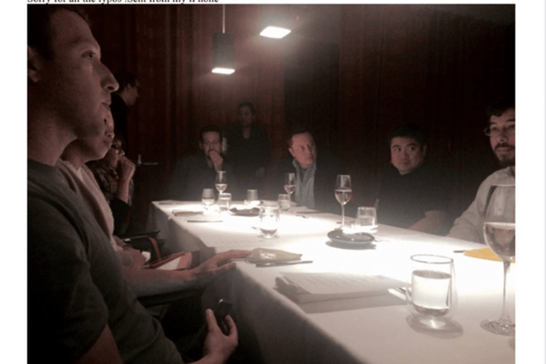 Kemudian, keesokan harinya ia mengirimkan email kepada dirinya sendiri sebuah gambar orang-orang yang duduk di sekitar meja makan, dengan Musk dan Zuckerberg terlihat dalam gambar tersebut.